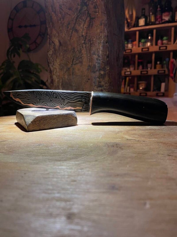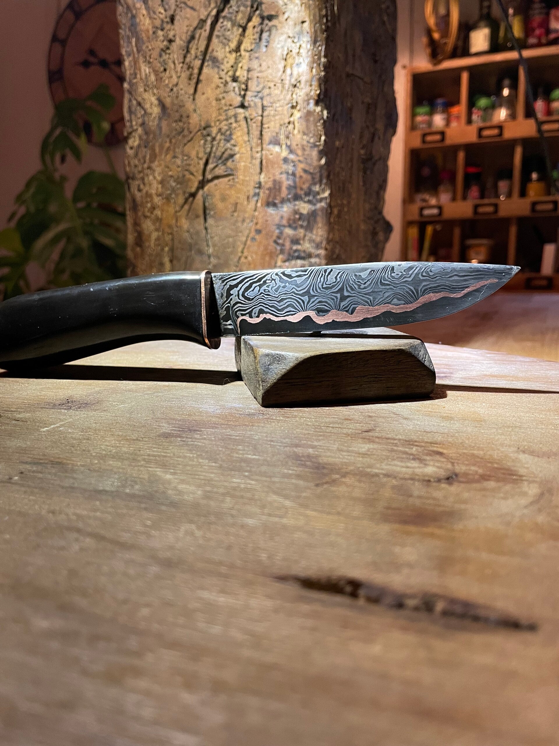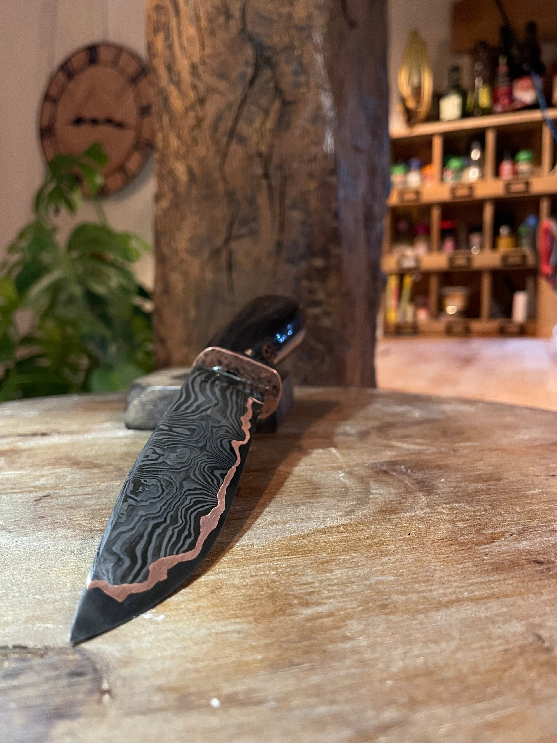 lame Damas multicouche avec 80crv2 au tranchant ,cuivre et Damas torsadé sur les coté